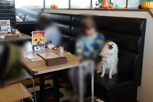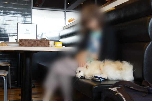 店内にイヌと一緒に入ることができます。イヌが椅子やソファーに座るのもOKです。マナーウェア(おむつ)をつける必要もありません。(他のイヌとトラブルになりそうになったら引っ張れるよう、リードはつけたままにしておきました。)