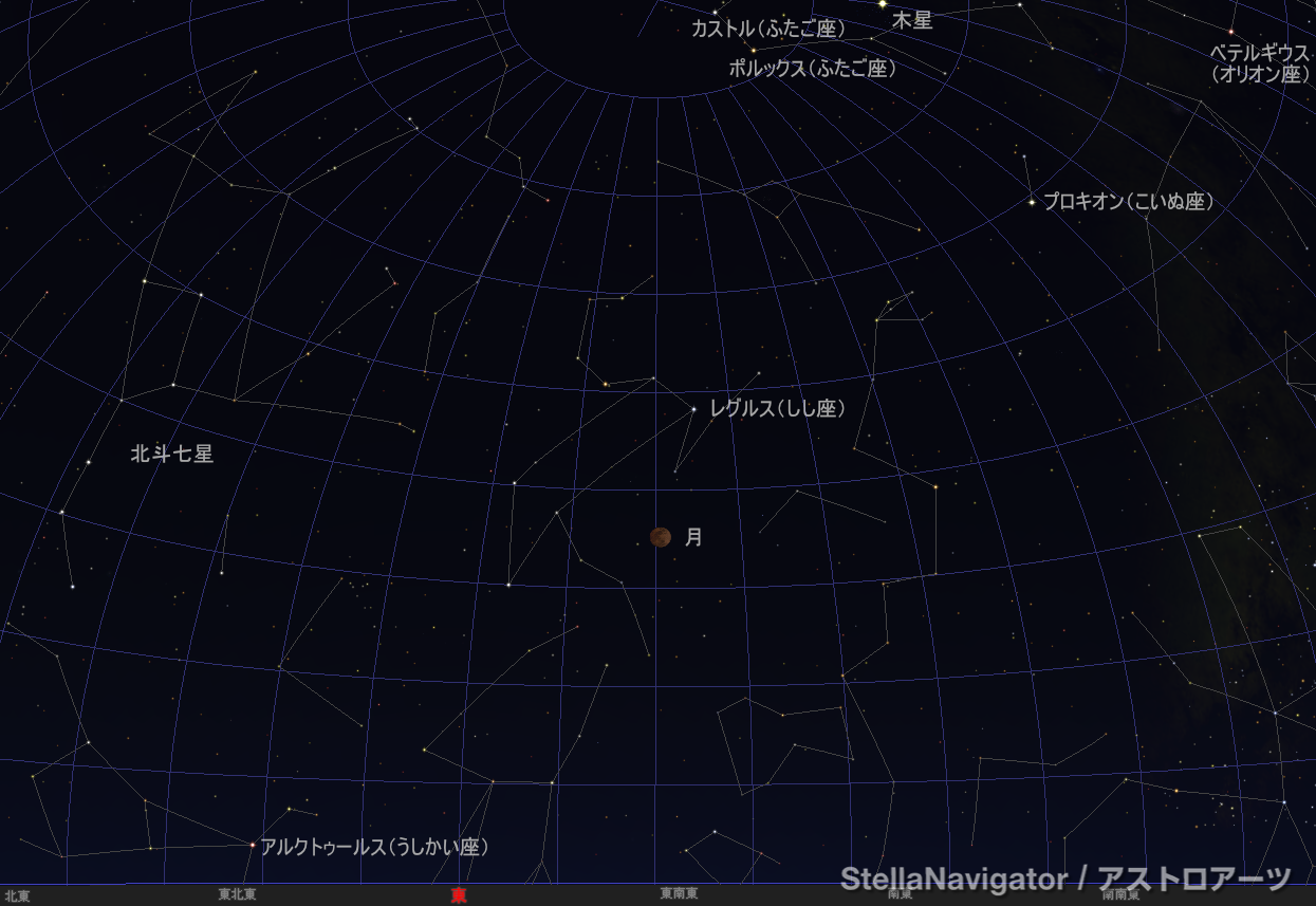 月は東の空の低い位置で欠け始め、右上に移動しながら皆既食となり、南東の見上げるくらいの高さで欠け終わります。